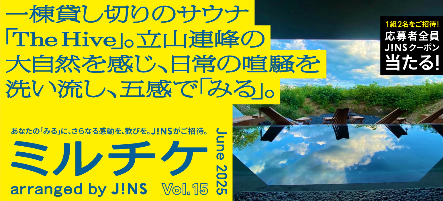 JINSのバナーデザイン - ミルチケ 1 2025/06/12 [ 旅行・観光・宿泊 ] 黄上品・落ち着きWebサイト横長 #fff002#000000#005d97 一棟貸し切りのサウナ「The Hive」。立山連峰の大自然を感じ、日常の喧騒を洗い流し、五感で「みる」。 あなたの「みる」に、さらなる感動を、歓びを。JINSがご招待。ミルチケ arranged by JINS Vol.15 June 2025 1組2名をご招待! 応募者全員JINSクーポン当たる! « 前のデザイン 次のデザイン »
